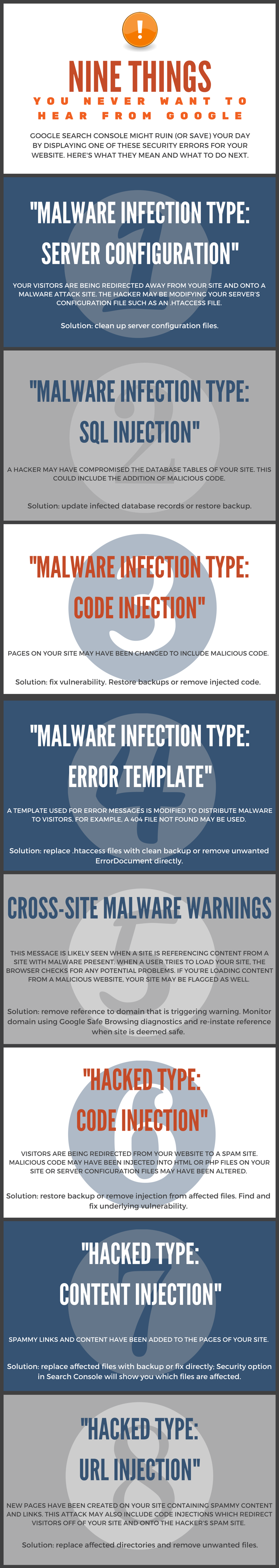 Google will also likely send you a message via Google Search Console, a free tool for webmasters. Search Console can display a variety of errors with a plethora of possible solutions, as outlined in the infographic below: