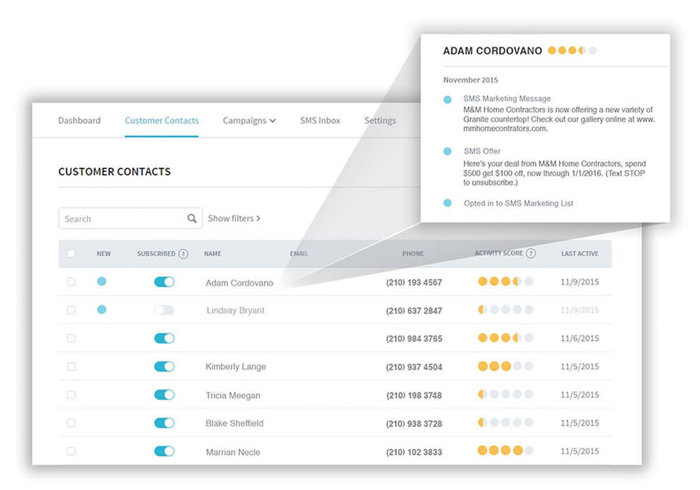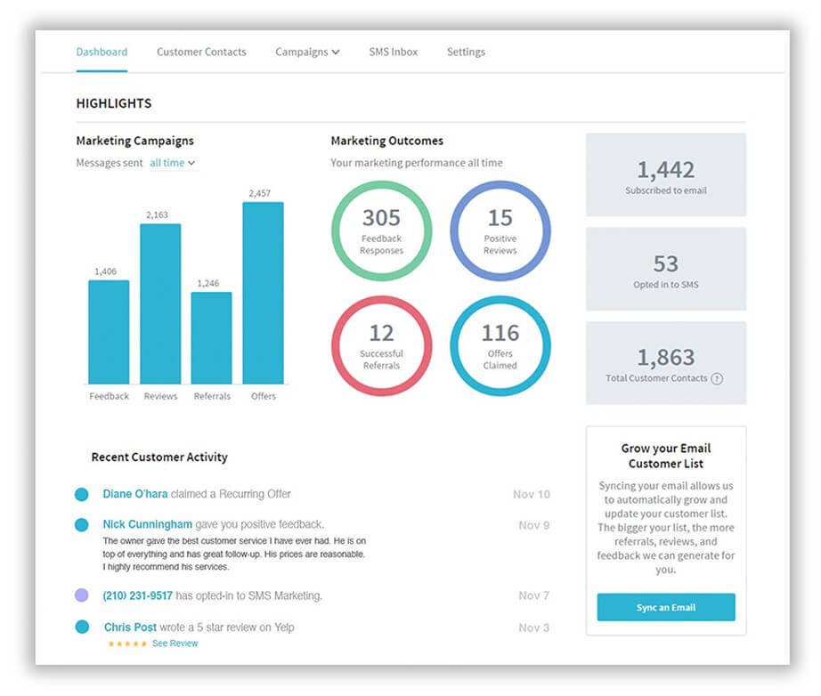 Fish bowls, pen and paper, Excel files, and old databases are yesterday’s news. Now you have a single source for your contacts and their history. See which of your customers are most active, referring clients, posting positive reviews on Yelp, and much more. Or just sit back and watch your list grow.